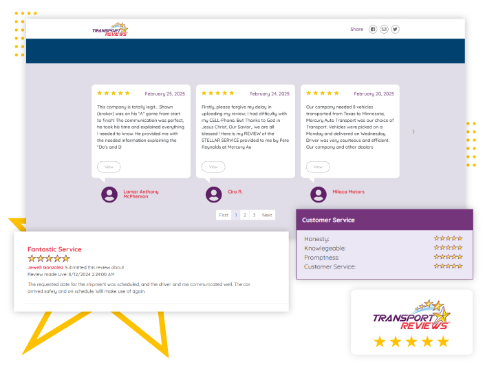 buyreviewus.com helps auto transport companies get a competitive edge by managing reviews, optimizing profiles, and enhancing reputations. We ensure that your company stands out on TransportReviews.com by writing genuine reviews, responding intelligently, and improving your profile's visibility.